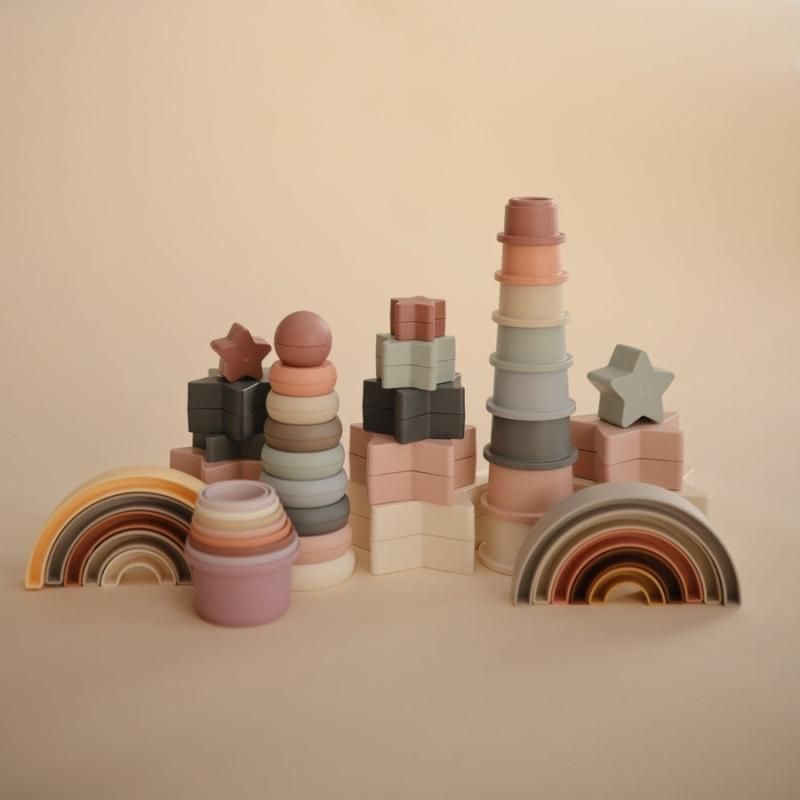 積み重ねたり、並べ替えたり、赤ちゃんの好奇心を刺激しながら、感覚や運動能力の発育を促進します。