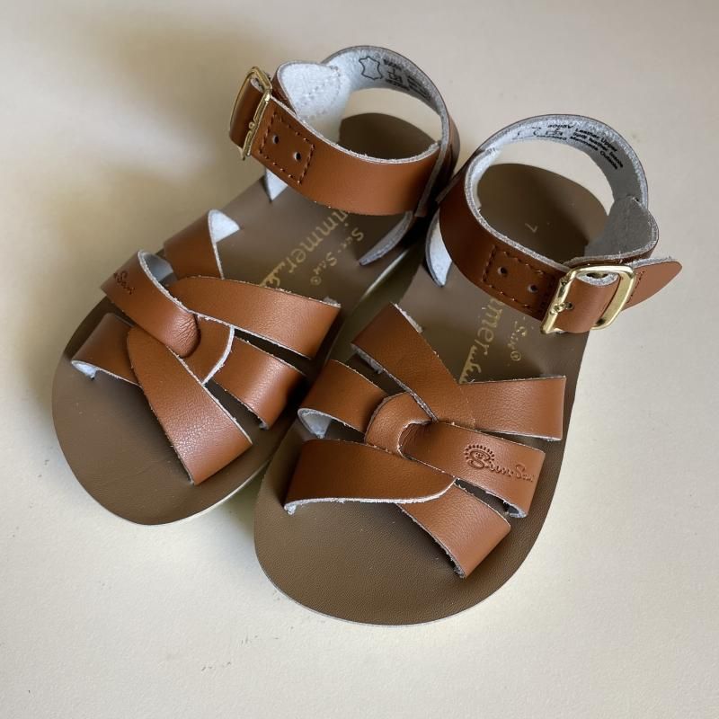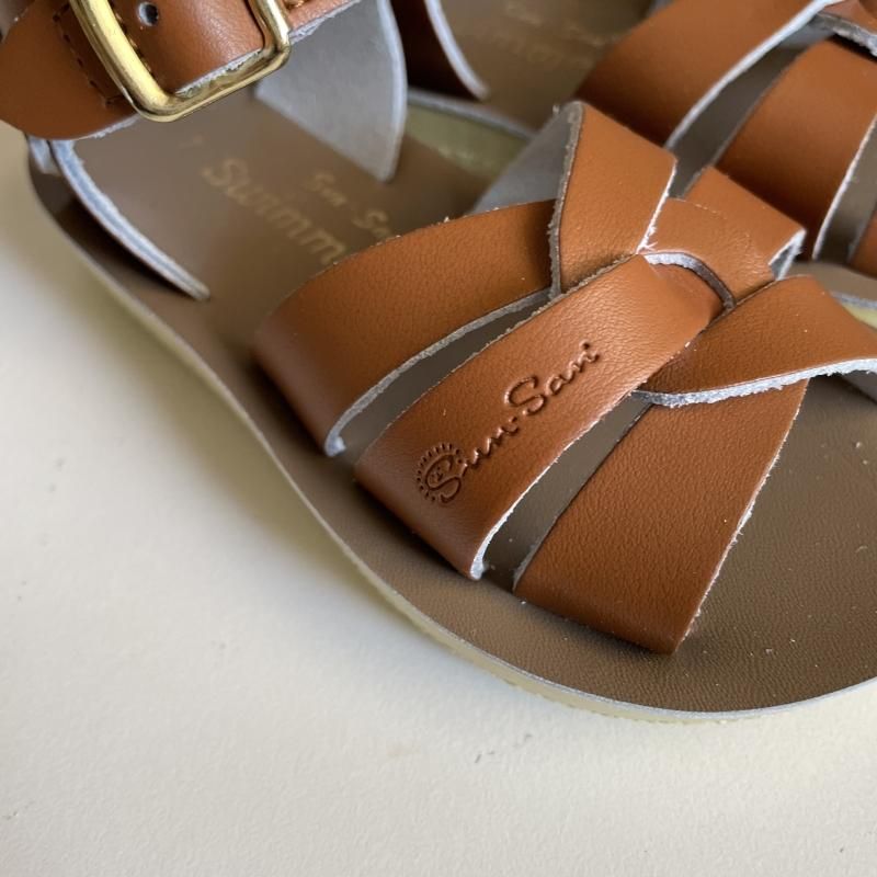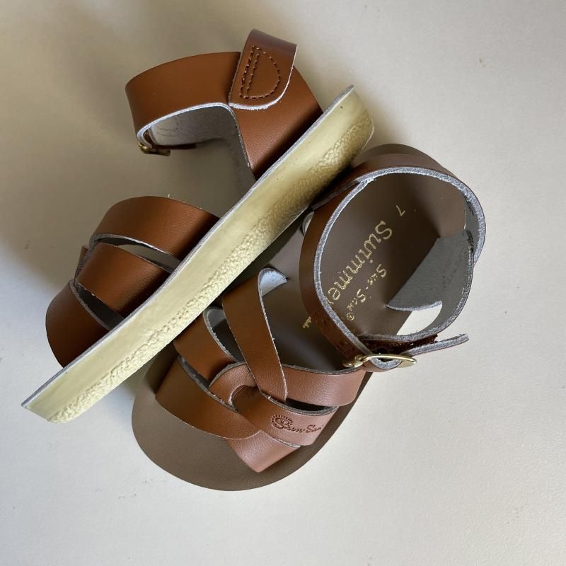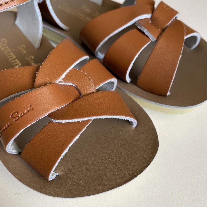 “スイマー”は、編み込みレザートップとバックル付きアンクルストラップが特徴の“ソルトウォーター”デザインをアレンジしたものです。フィット感を少し高めて、“サンサン”ラインの特徴であるクッション性抜群のウレタンソールとさび止め加工済みのバックルで仕上げました。冷水であれば洗濯機で水洗いOKです。
