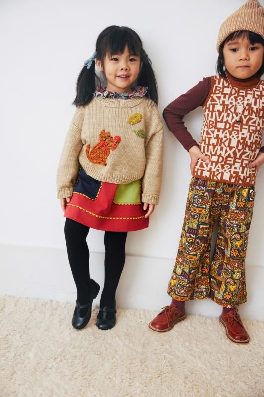 機械編み - ファインゲージ ファインゲージのピマコットン ジャカード編みのノースリーブ モックネック シェル。遊び心のあるアルファベット デザイン。リブ編みのネックと無地のトリムが特徴です。重ね着にも、暖かい日には単体でも着用できます。