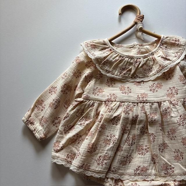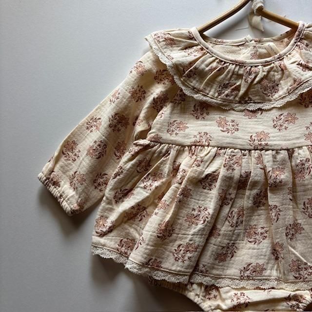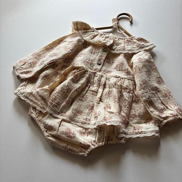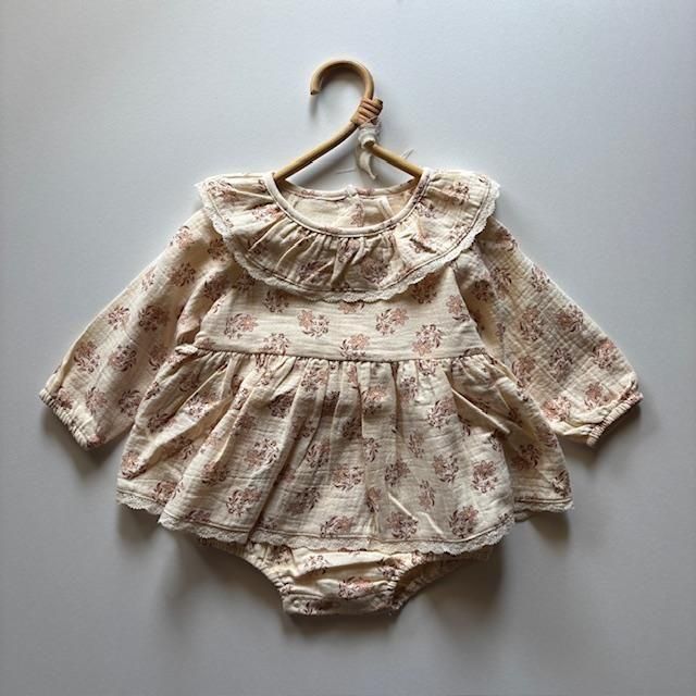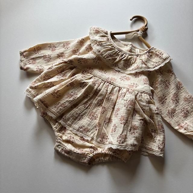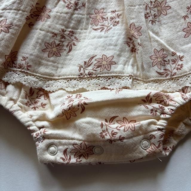 タリアロンパースは、可愛らしい襟、繊細なレースのトリム、ギャザーウエスト、背中のココナッツボタン、そして着替えが簡単なボトムスナップが特徴です。